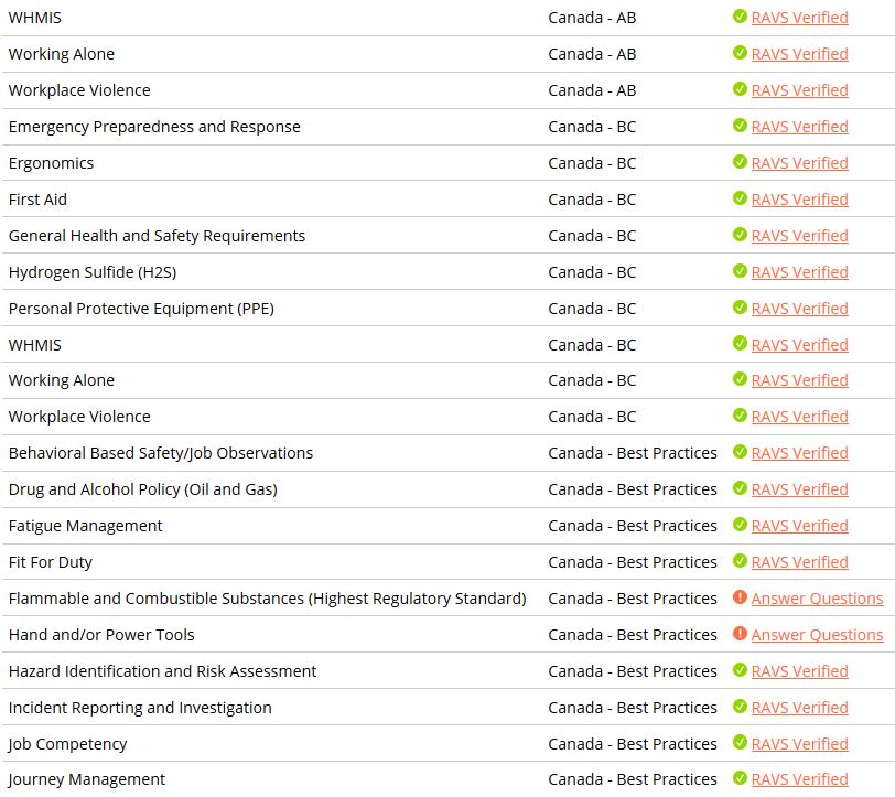 Third party compliance registries, such as ®ISNetworld*, ®ComplyWorks, ®Avetta, ®CQ Network, etc., are an online resource for monitoring the safety programs and performance of their contractors and subcontractors. The requirements to maintain an account in good standing are based on work types and province for each contractor/subcontractor. These can also be different depending on the client companies connected to the account, and can fluctuate as client companies are added, removed, change or add to their requirements, or as new legislation and best practices are introduced and adapted.